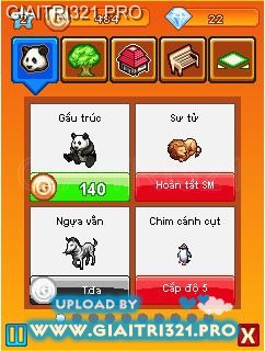 - Thực hiện các nhiệm vụ để lên cấp. Đồng thời cũng nâng cấp sở thú của bạn để thu hút khách. Game được sản xuất bởi GameLoft, ngôn ngữ trong game là tiếng Việt. Hỗ trợ hầu hết các loại màn hình.
